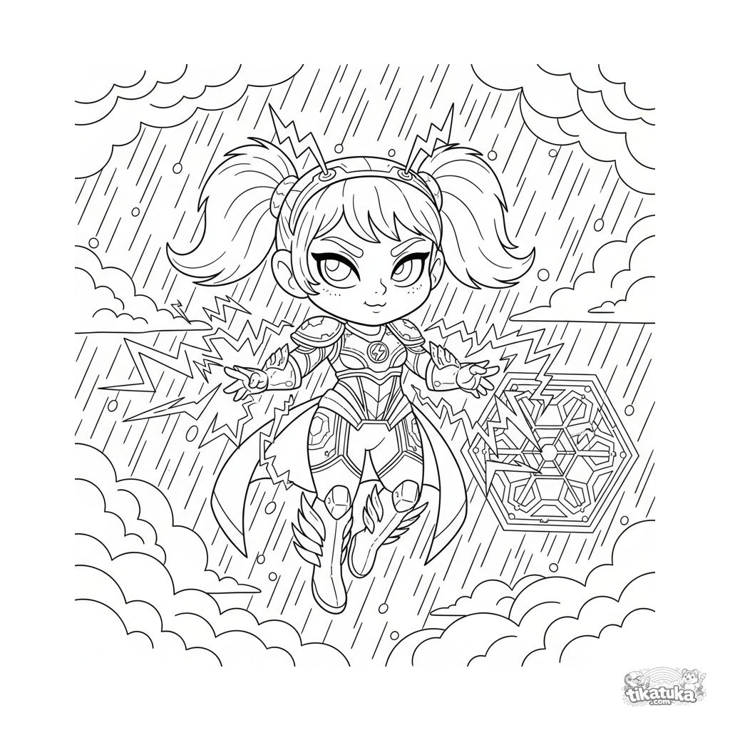 Página para colorear para niños 10-12: un superhéroe con poderes de relámpago flota en un cielo de tormenta, canalizando energía. Escena dinámica.