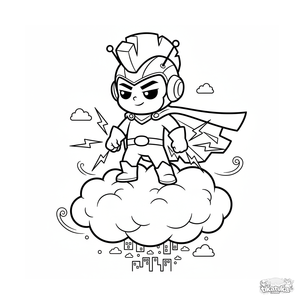 Página para colorear para 7-9 años: un superhéroe relámpago en una nube de tormenta, con chispas eléctricas en sus manos, mirando la ciudad.