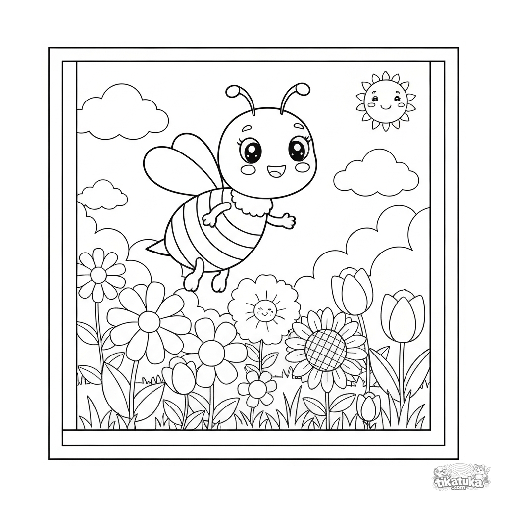 Una alegre abejita vuela entre flores brillantes. ¡Colorea el jardín soleado y ayúdala a recolectar néctar!