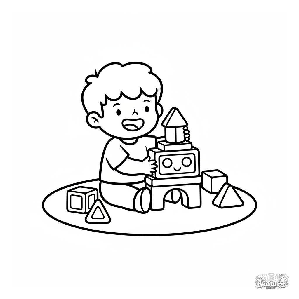 Página para colorear muy simple para niños pequeños 2-3: un niño construye una torre con bloques magnéticos grandes en un laboratorio secreto.