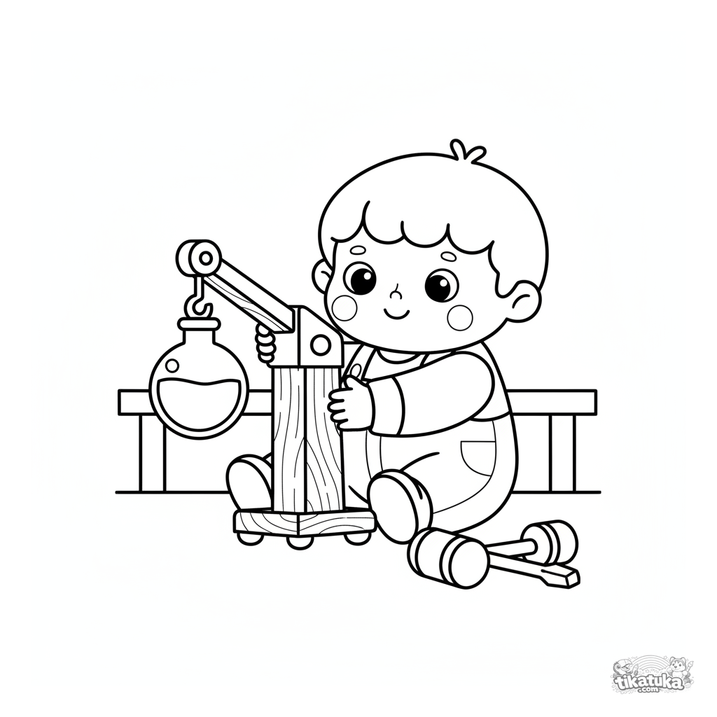 Página para colorear muy simple para niños pequeños 2-3: un niño juega con una grúa de juguete en el laboratorio.