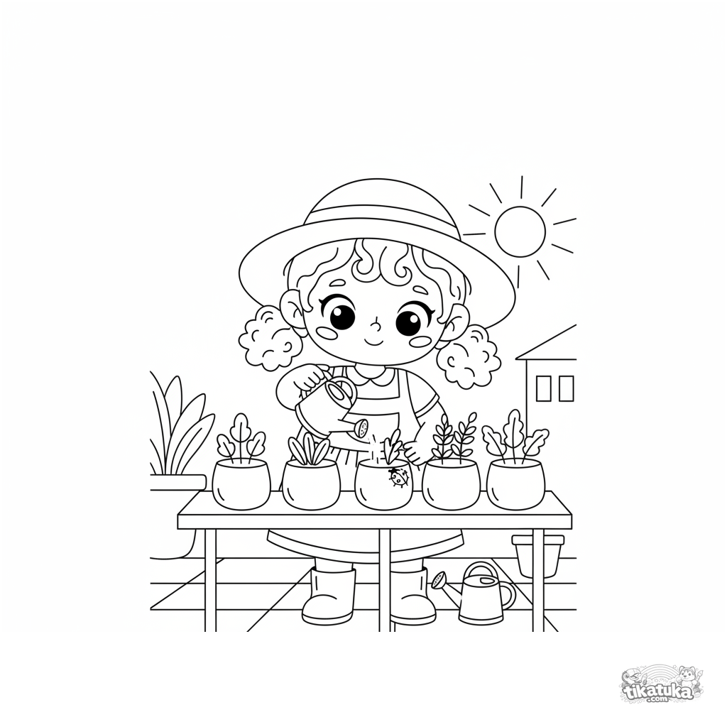 Página simple para colorear para niños pequeños 2-3 años: una niña regando flores en un balcón. Formas grandes, detalles mínimos.