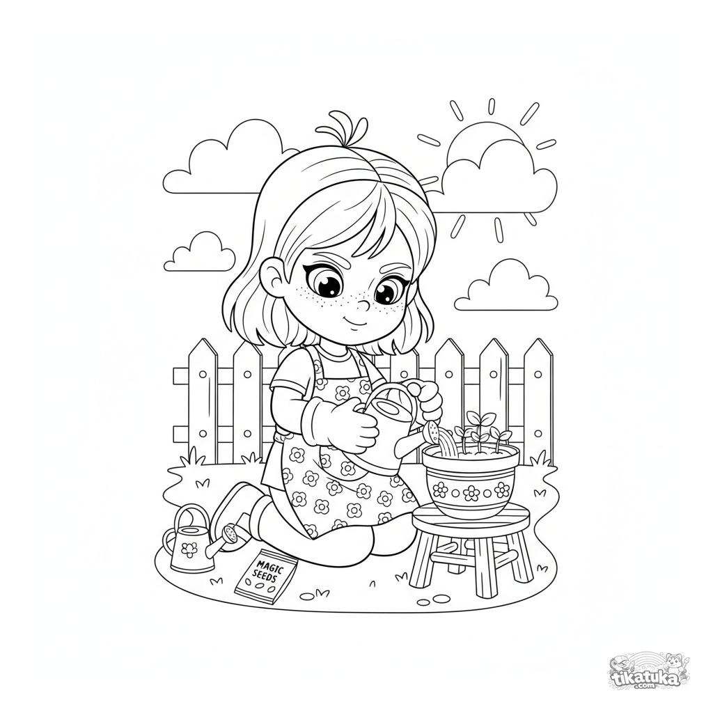 Página para colorear para niñas de 4-6 años: una pequeña jardinera con delantal riega los primeros brotes en una maceta. Escena linda y simple.