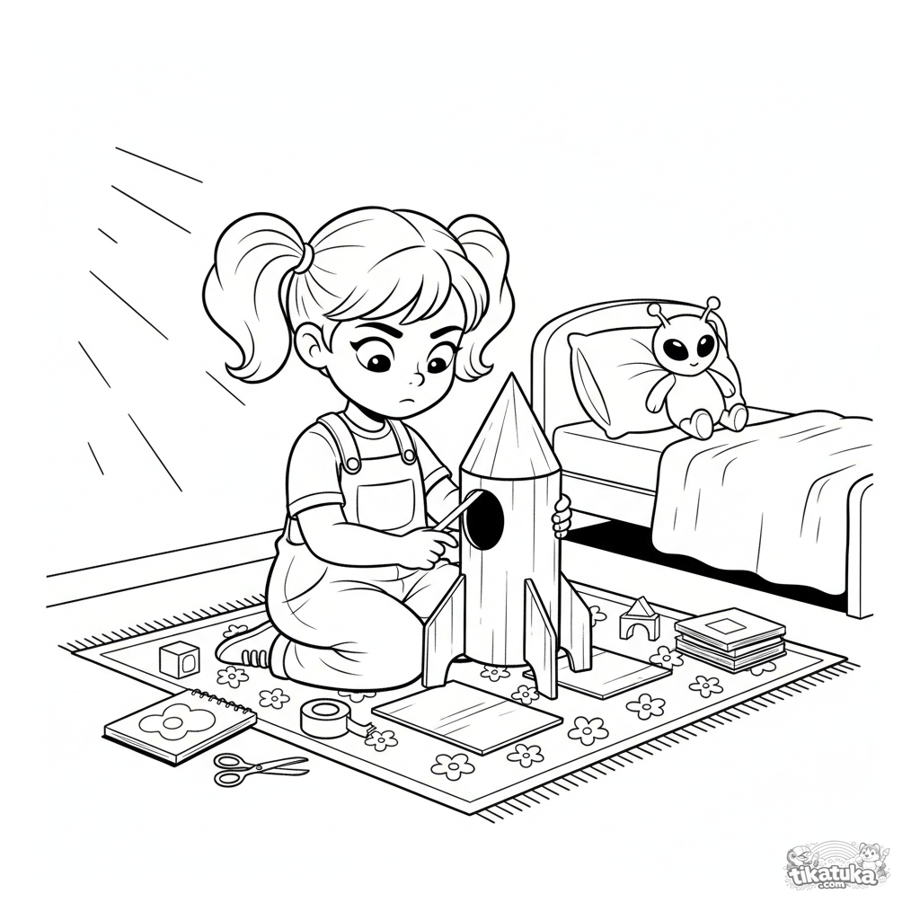 Página para colorear de una niña construyendo una nave espacial de cartón en su dormitorio. Para niños de 4 a 6 años.
