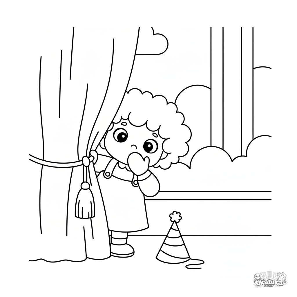 Página para colorear para niños pequeños de 2-3 años: una niña con pelo rizado se asoma tímidamente detrás de una cortina festiva. Formas grandes y simples, márgenes amplios.