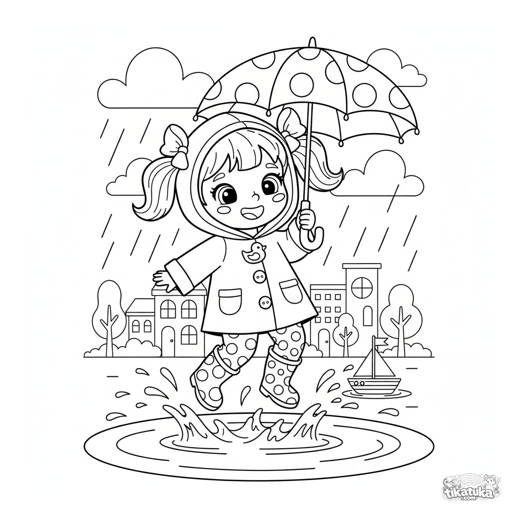Divertida página para colorear para niñas de 4-6 años: una niña con impermeable salta en un charco bajo la lluvia. Una escena brillante y simple desarrolla la imaginación y la creatividad.