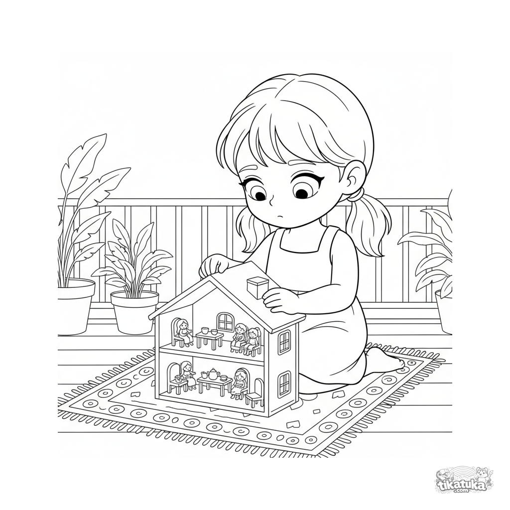 Página para colorear para niños 7-9: una niña en vestido de verano ordena muebles en una casa de muñecas en el suelo del porche. Escena con muchos detalles pequeños.