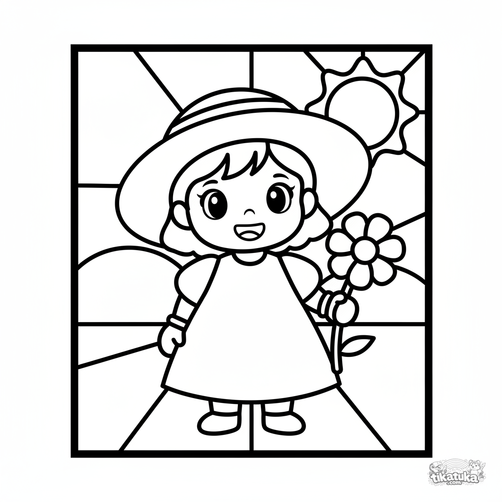 Página para colorear para niñas de 2-3 años: una niña linda con un sombrero grande y una flor. Detalles grandes, contornos simples. Página para pintar por números para niños.
