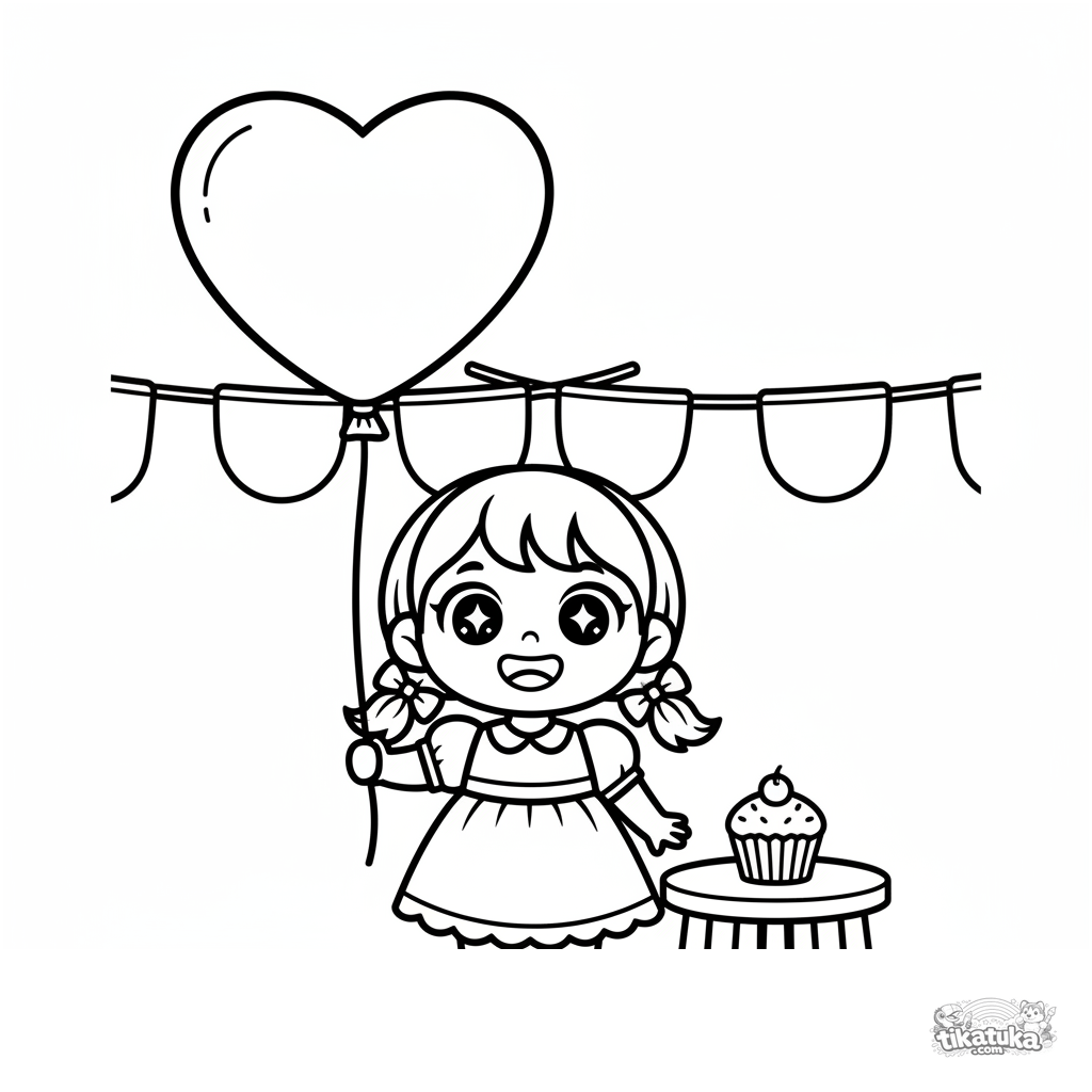 Página para colorear para niños pequeños 2-3 años: una niña en un salón festivo mira un globo gigante con forma de corazón, con una magdalena cerca.