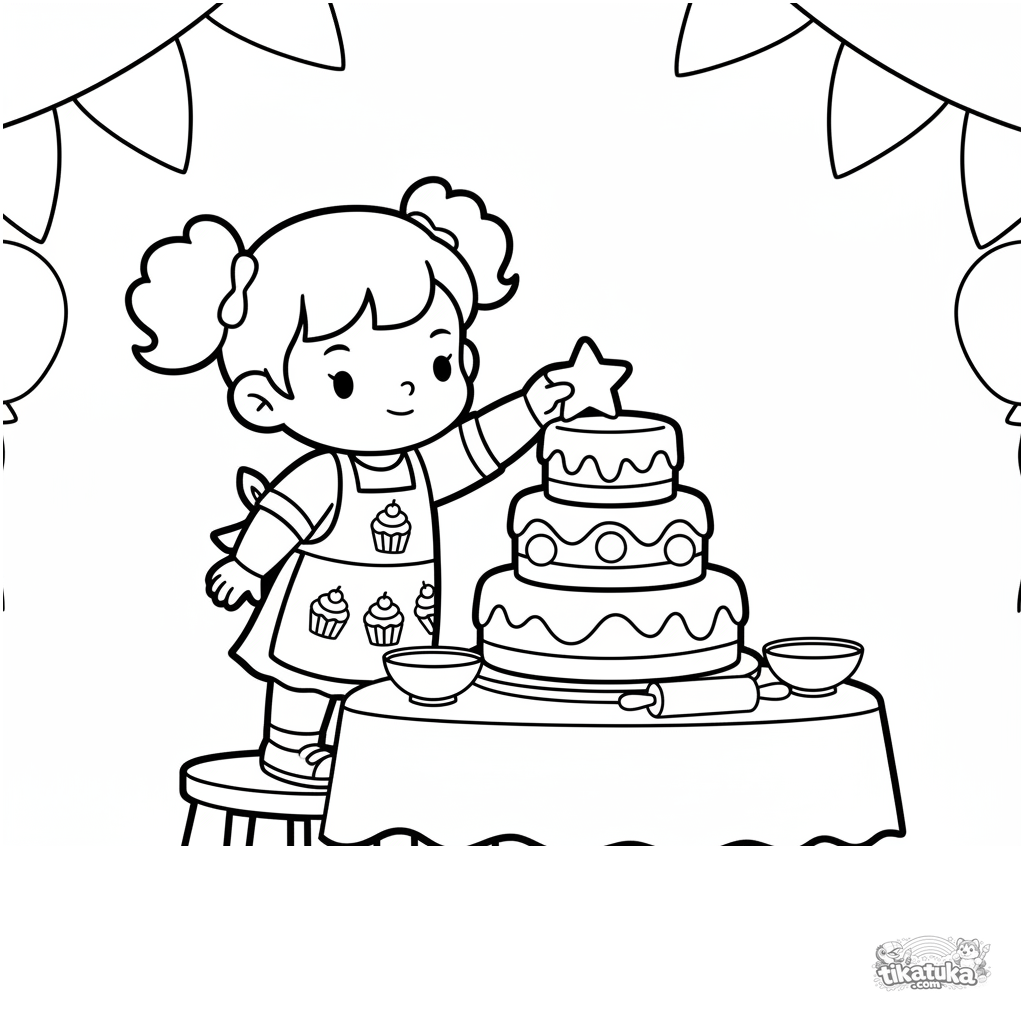 Página para colorear para niños pequeños 2-3: una niña pequeña con delantal decora un pastel de celebración en un salón de banquetes. Formas grandes y simples, pocos detalles, amplios márgenes para colorear.