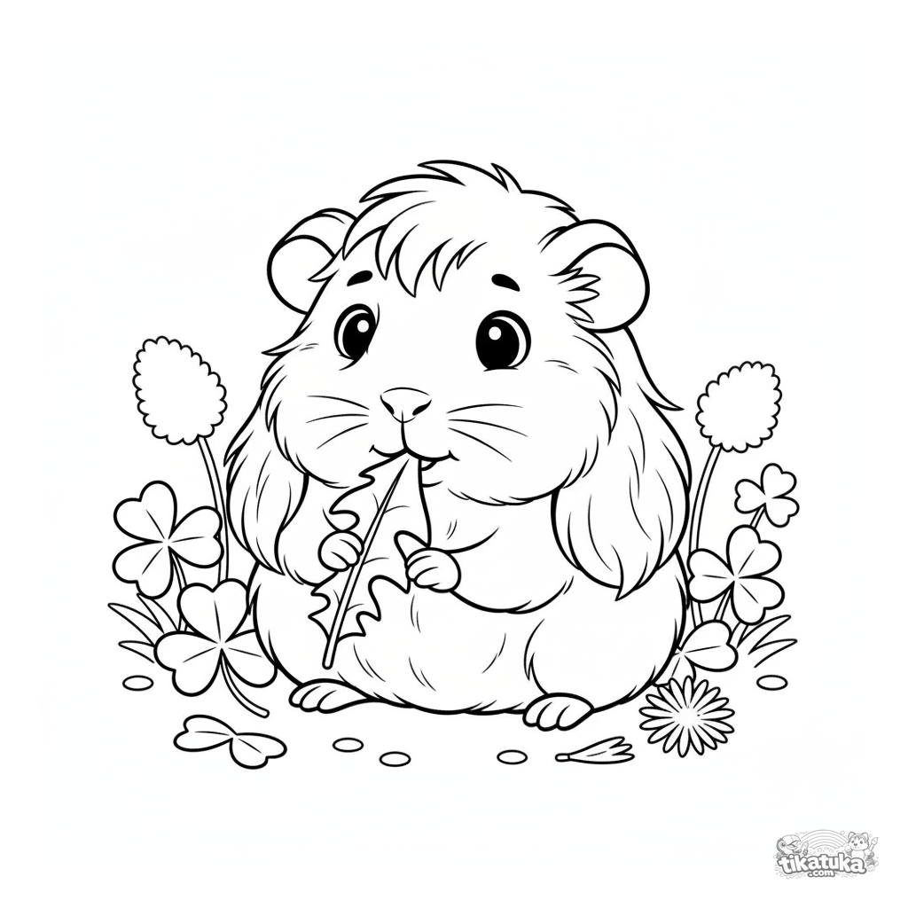 Página para colorear para niños de 4-6 años: una cobaya peluda en un trébol mordisquea una hoja de diente de león. Escena linda y simple.