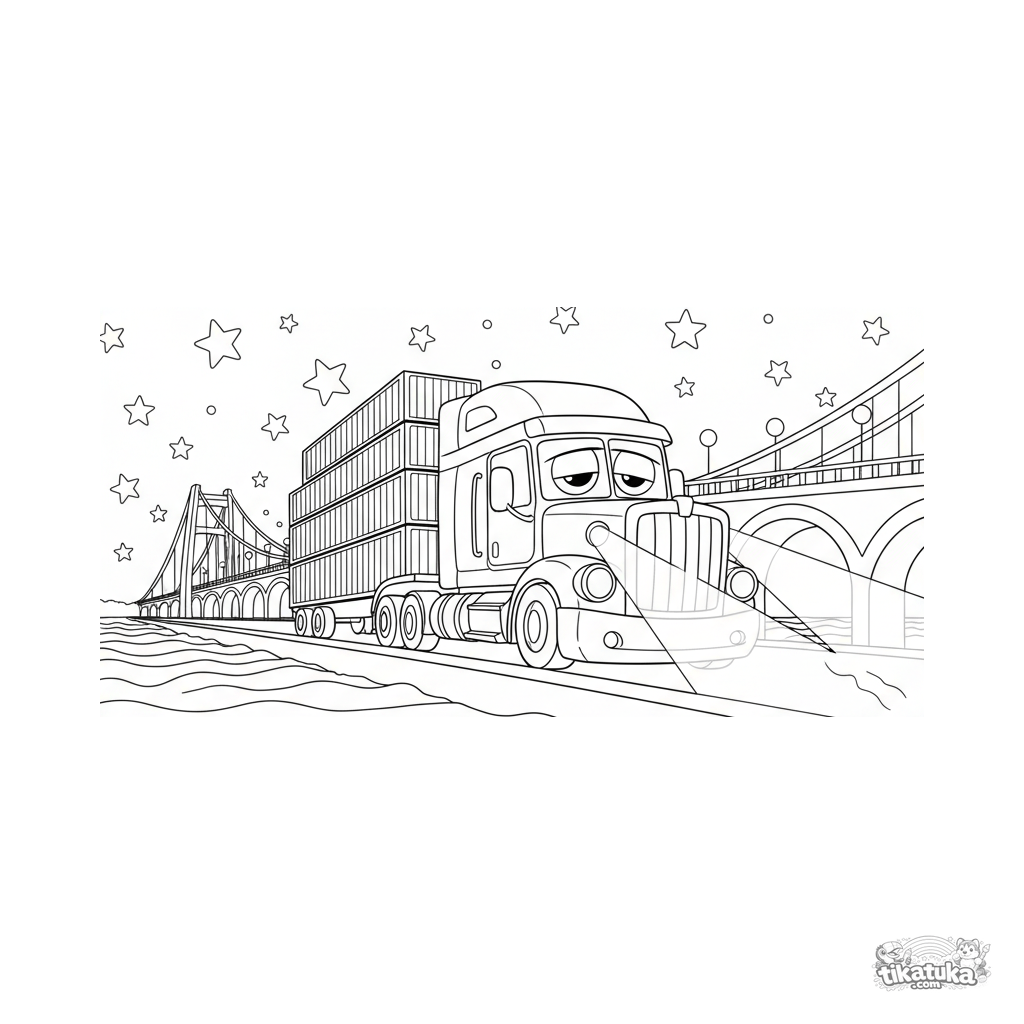 Página para colorear para niños 7-9: un gran camión trailer con contenedores cruza un puente iluminado sobre un río de noche. Escena atmosférica estilo novela gráfica.