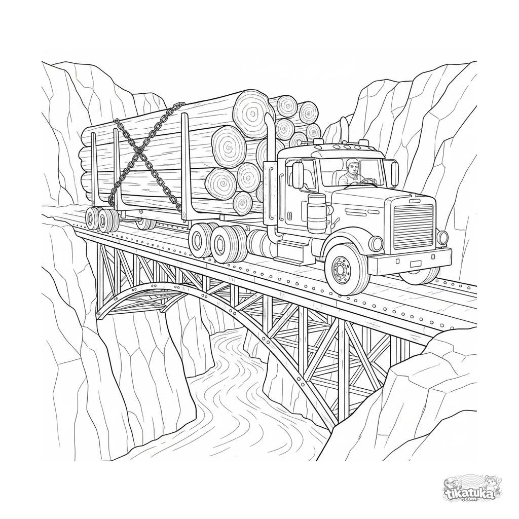 Página para colorear para mayores 10-12: un largo camión maderero con troncos cruza con cuidado un viejo puente de acero sobre un cañón.