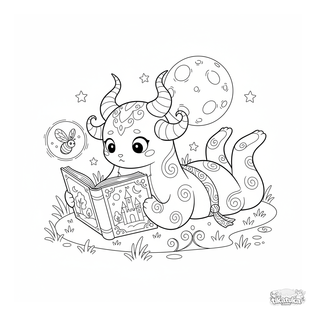 Página para colorear para niños mayores de 7-12 años: un monstruo largo con cuernos rizados leyendo un libro en un patio iluminado por la luna.
