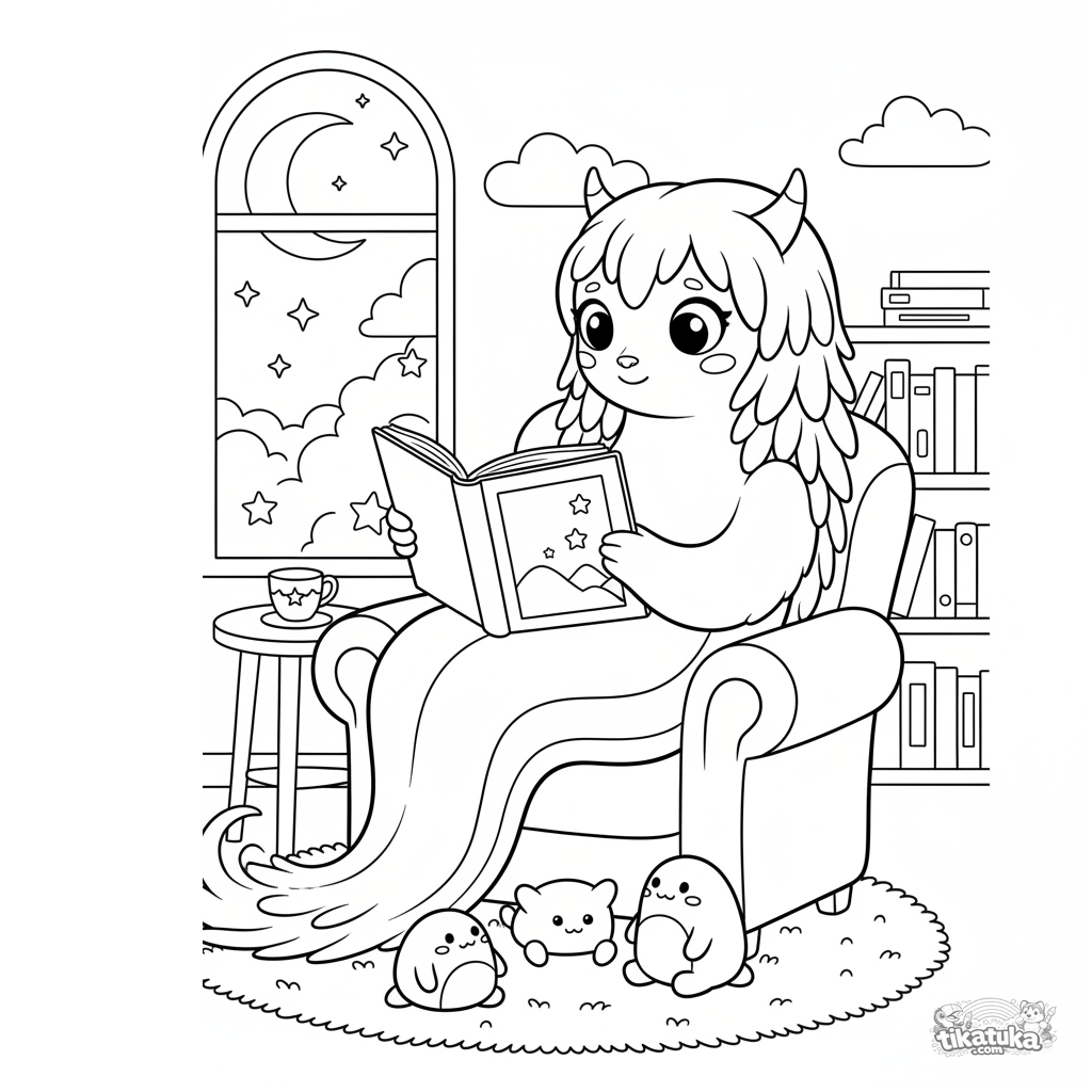 Página para colorear para niños 4-6: un monstruo largo con pelo plumoso lee un cuento a peluches en un dormitorio acogedor a la luz de la luna. Escena tranquila.