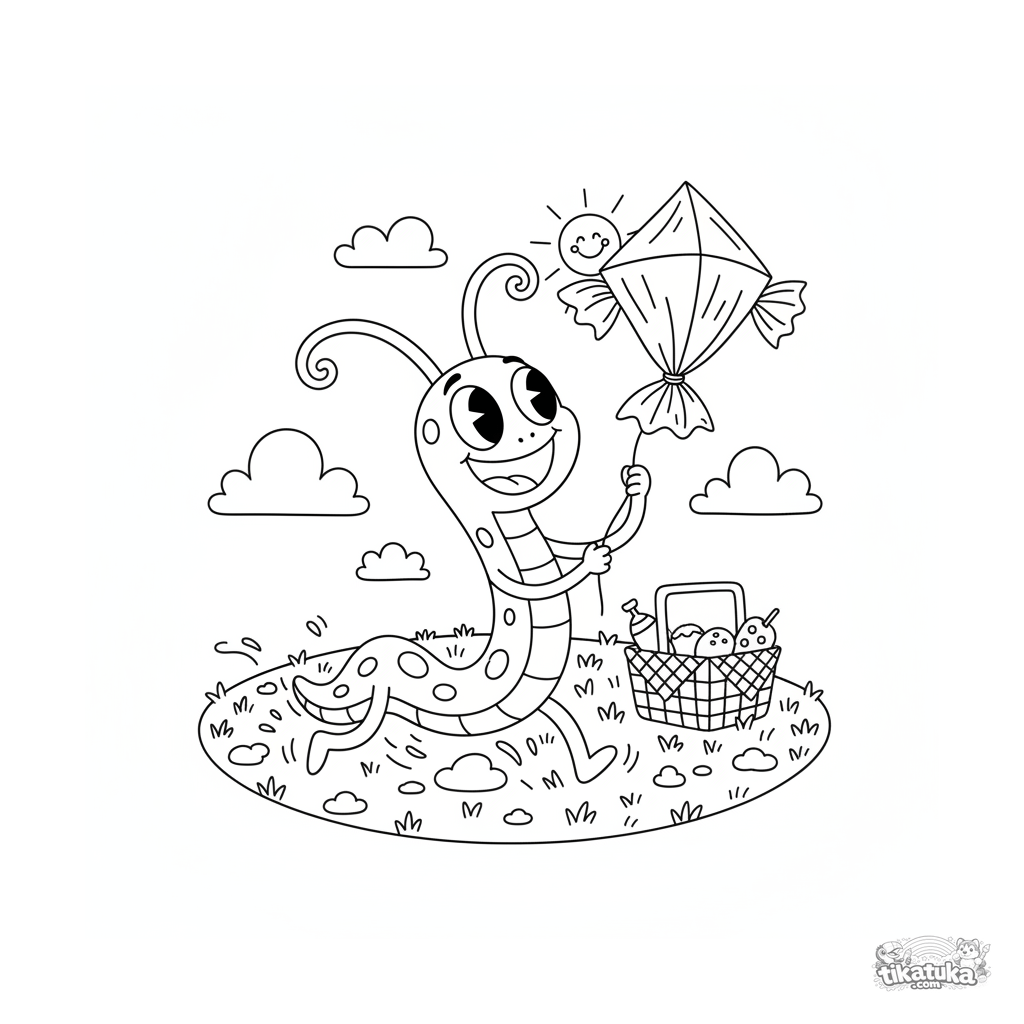 Página para colorear estilo retro para preadolescentes de 7 a 9 años: un monstruo largo corre volando una cometa de envoltorio de caramelo en un picnic. Pose dinámica.