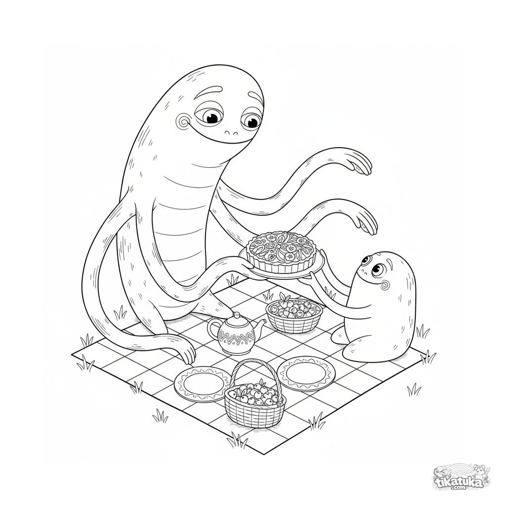 Página detallada para colorear para niños 10-12: un monstruo largo pasando un plato de tarta de frutas en un picnic. Pose dinámica, detalles de comida.