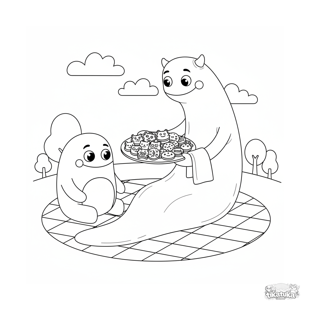 Página para colorear para 7-9 años: un monstruo largo y amable comparte un plato de galletas con forma de monstruo con un amigo en un picnic. Escena sobre amistad.