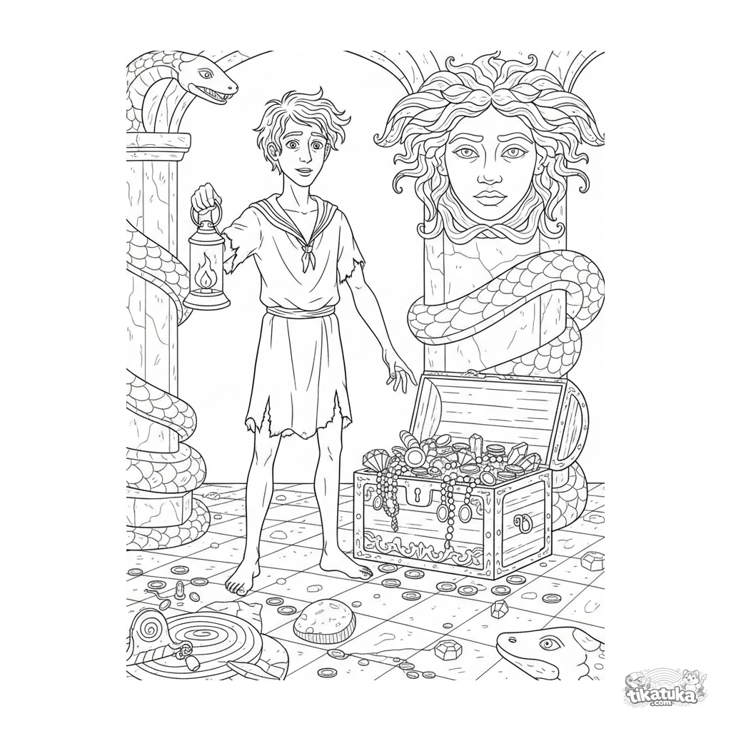Página para colorear compleja para niños de 10-12 años: un marinero perdido encuentra un cofre del tesoro en la lúgubre guarida de Medusa la Gorgona. Escena detallada en estilo grabado vintage.