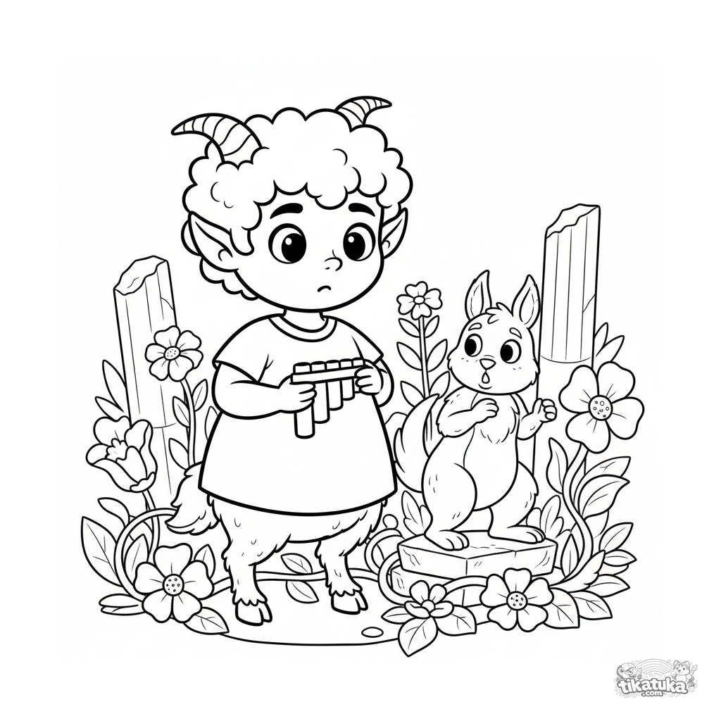 Página para colorear para niños 4-6: un joven sátiro con patas de cabra y una flauta de pan parece confundido en un jardín petrificado.