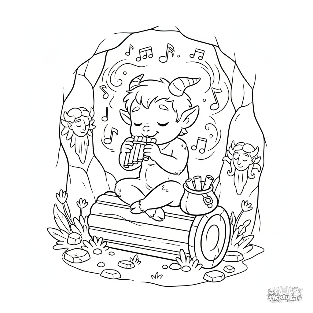 Página para colorear: un sátiro alegre tocando la flauta de Pan en la guarida de la Gorgona. Para niños de 4 a 6 años. Incluye cuernos de cabra, pezuñas, notas musicales y una columna de piedra.