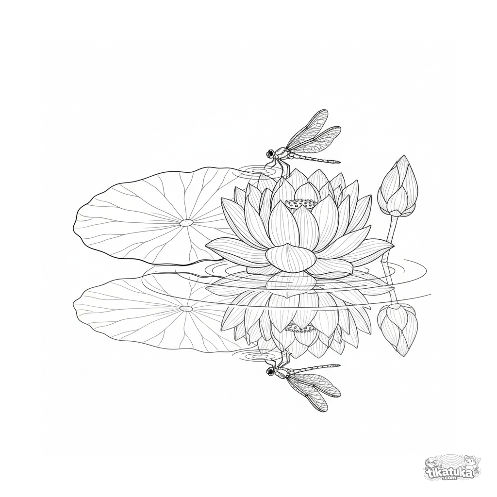 Página para colorear detallada para 10-12 años: una flor de loto flota en un estanque, con una libélula aterrizando en ella.