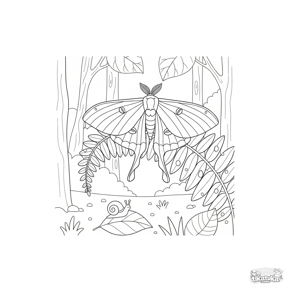 Página para colorear para niños: una hermosa polilla luna con alas estampadas descansando en un helecho. Para 4-6 años.