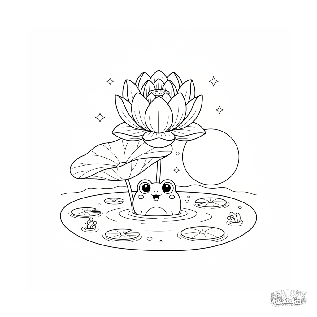 Página para colorear para preadolescentes: un loto mágico gigante flota en un estanque a la luz de la luna, con una ranita asomándose. Escena encantada, detalle moderado.