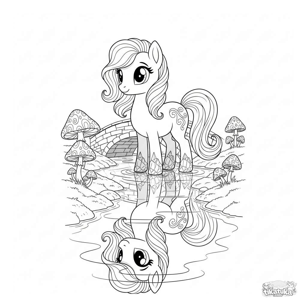 Página para colorear de un poni mágico junto a un arroyo del bosque. Para niños de 6 a 9 años. El poni tiene cascos de cristal, mira su reflejo, rodeado de hongos brillantes y un puente de piedra.