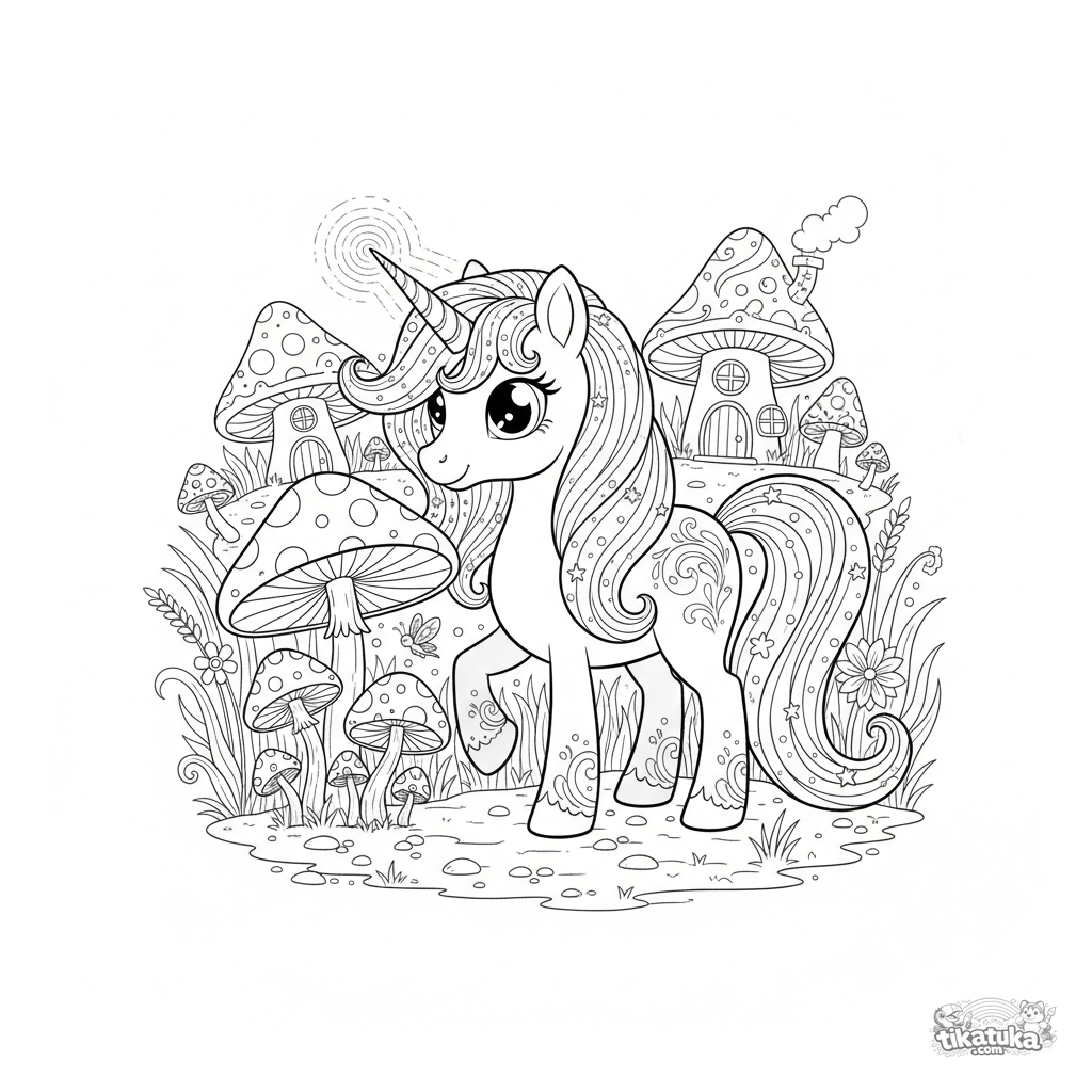 Página para colorear difícil de un poni mágico pastando en un prado encantado entre setas brillantes y hadas. Para niños de 8 años en adelante.