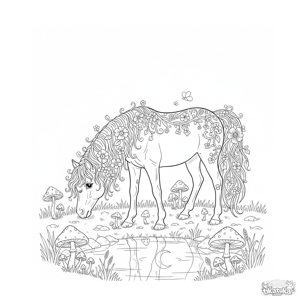Página para colorear de un poni mágico con crin de flores, pastando en un prado a la luz de la luna. Para niños de 8 a 12 años. Escena detallada con hongos brillantes y un estanque reflectante.