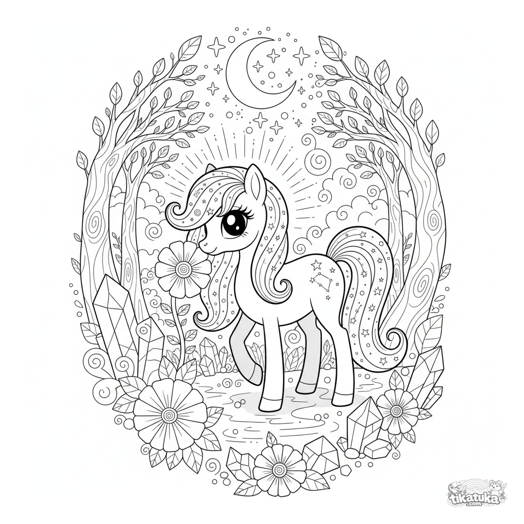 Página para colorear de un poni mágico con una crin de luz estelar pastando en una arboleda a la luz de la luna. Para niños de 8-12 años.
