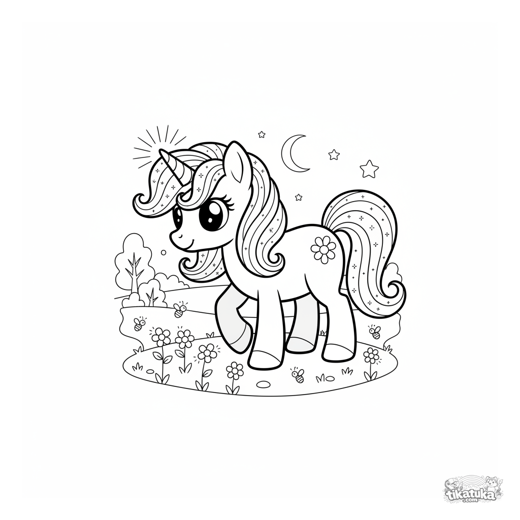 Página para colorear para niñas de 4-6 años: un poni mágico con crin de polvo de estrellas pace flores brillantes en un prado al anochecer.