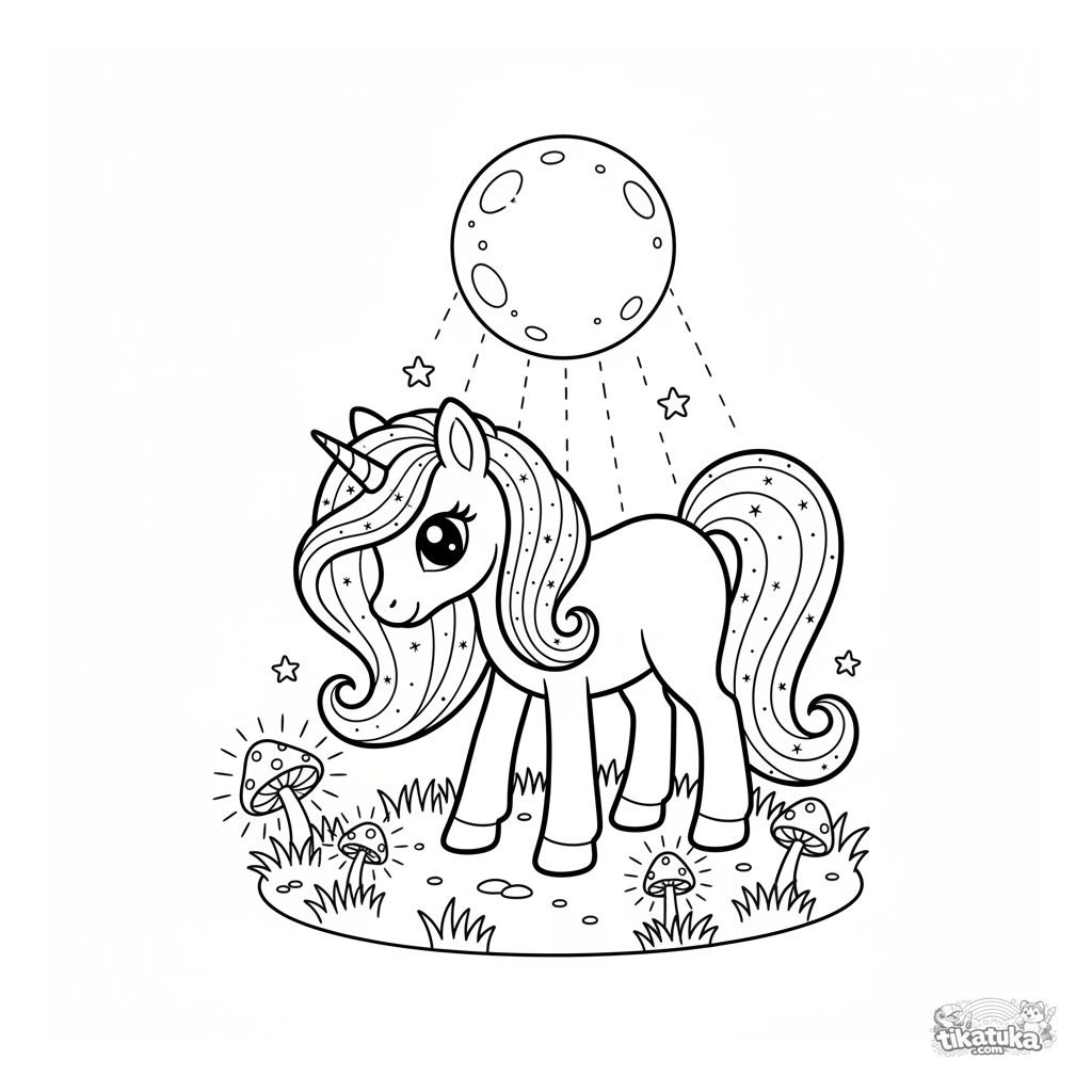 Página para colorear para niñas de 4-6 años: un poni mágico con crin de estrellas pace en un prado a la luz de la luna entre hongos brillantes. Escena de cuento.