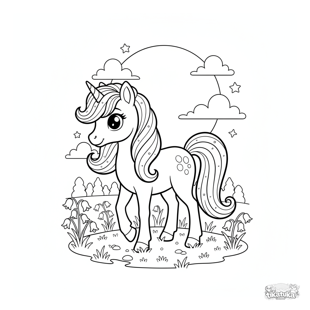 Página para colorear para niñas de 4-6 años: un poni mágico con crin brillante en un prado a la luz de la luna. Una escena de cuento y tranquila para colorear.