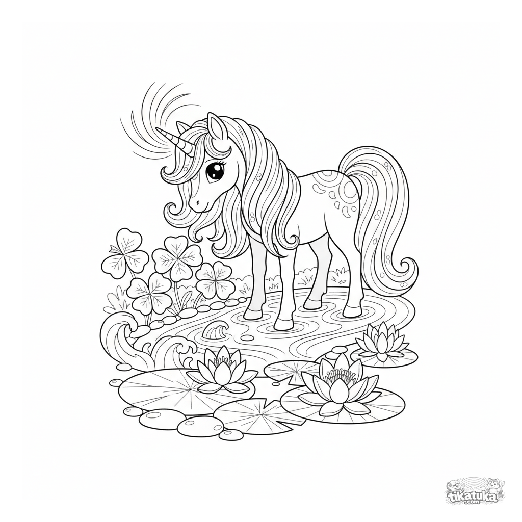 Página para colorear de un poni mágico con crin como agua pastando junto a un arroyo. Escena encantada y detallada para niños de 6-9 años.