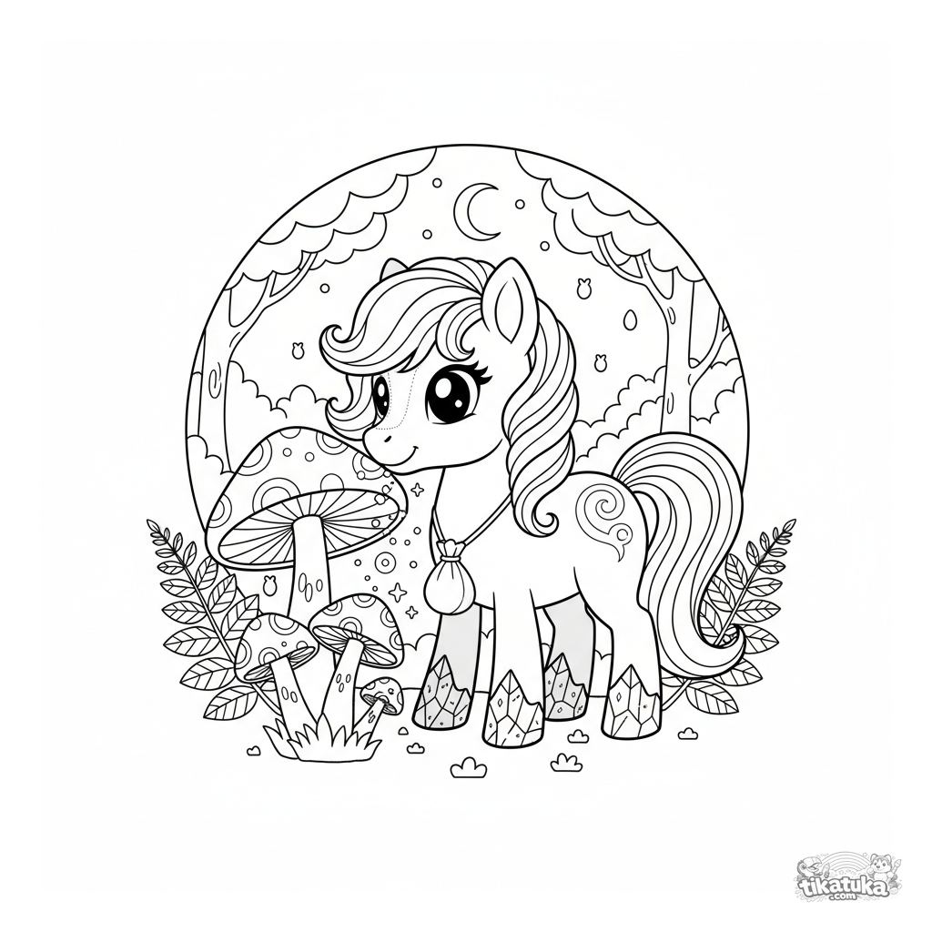 Página para colorear intrincada de un poni mágico recolectando polvo de estrellas de hongos brillantes en un claro a la luz de la luna. Imagen detallada con cascos de cristal para niños de 8 a 12 años.