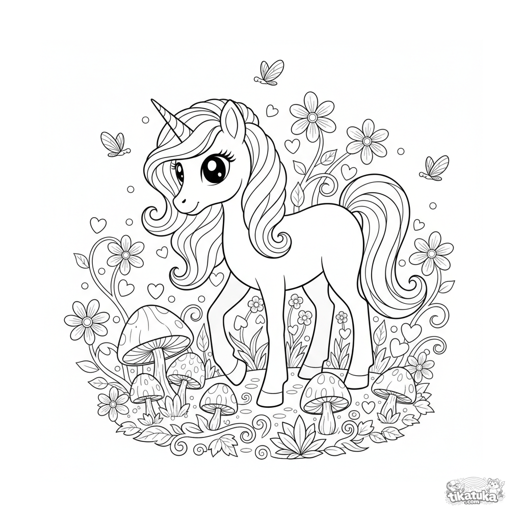 Página para colorear de un poni mágico con cuerno de cristal pastando entre setas brillantes en una arboleda encantada. Para niños de 8 a 12 años.