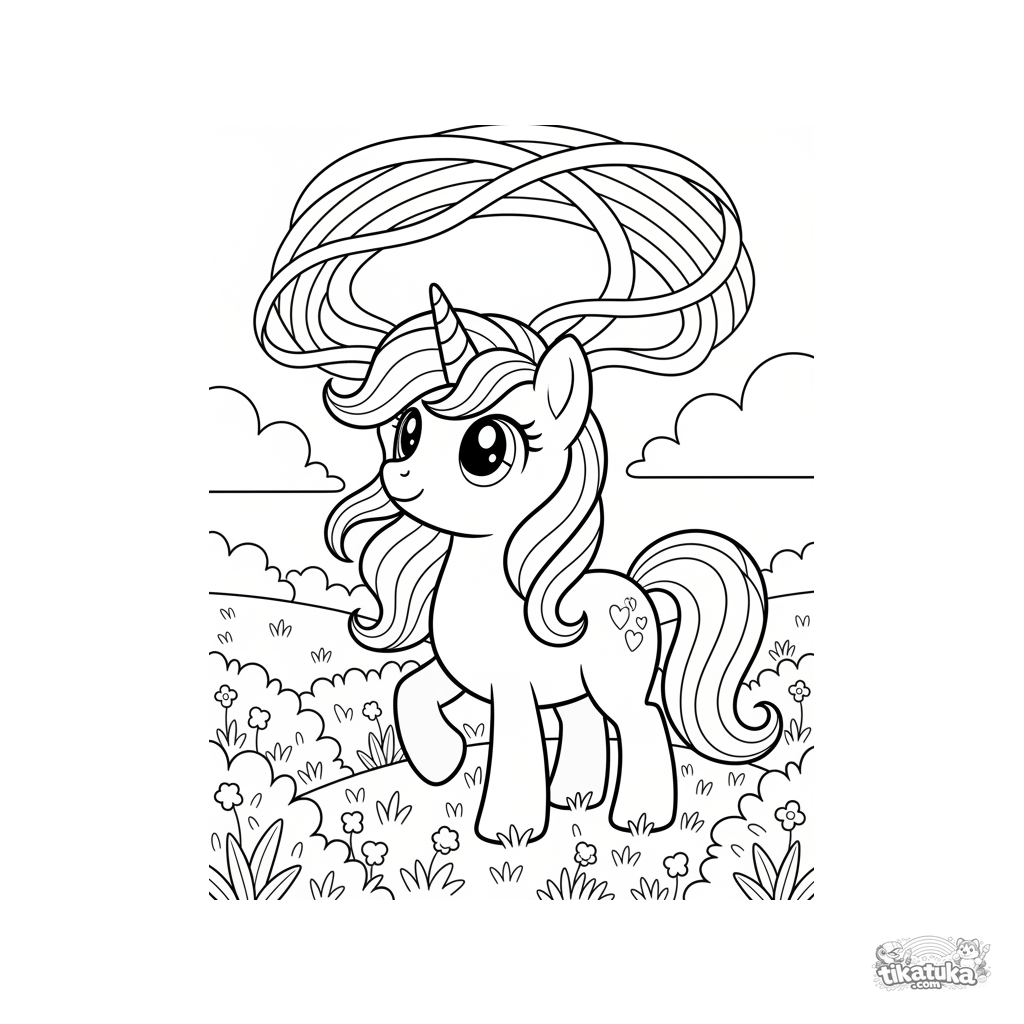 Página para colorear para niñas de 4-6 años: un poni unicornio mágico con cuerno de cristal teje un arcoíris en un prado florido. Escena de fantasía hermosa y dulce.