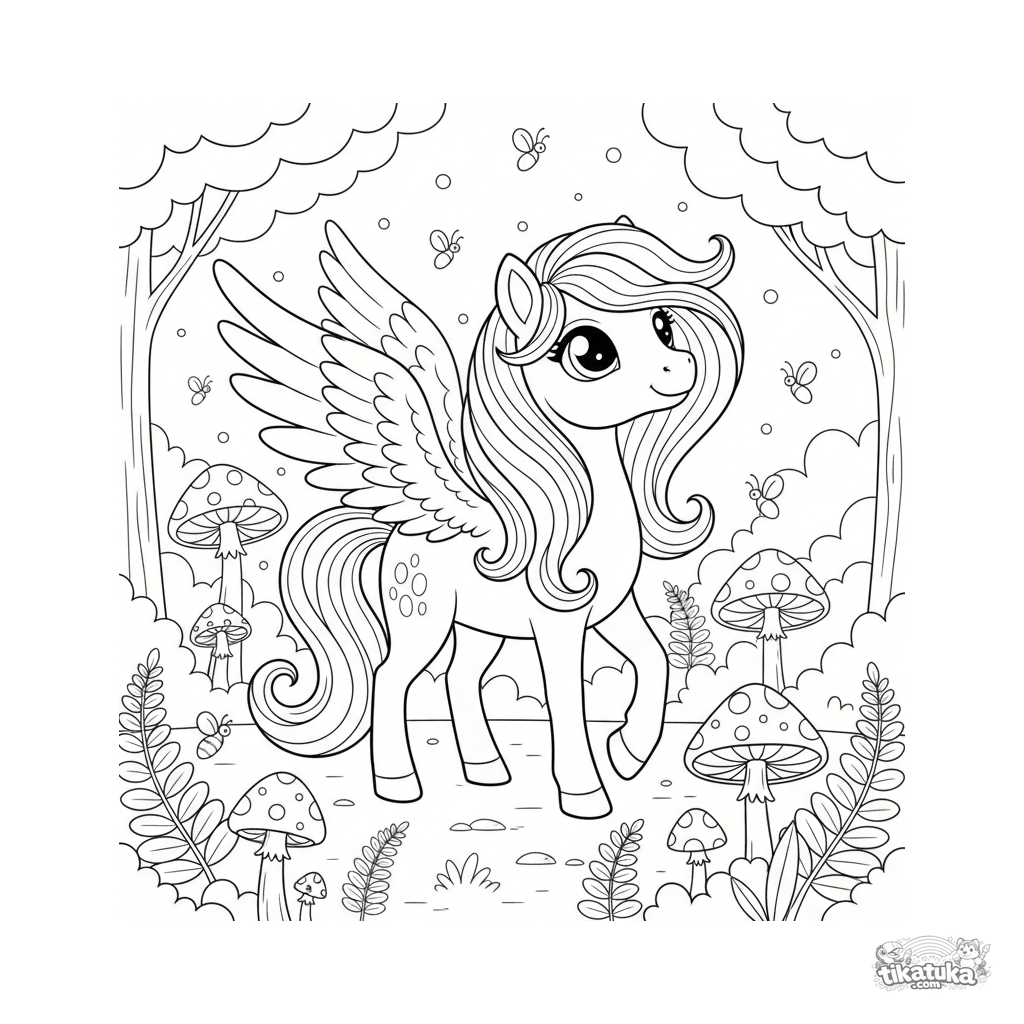 Página para colorear para niñas de 4 a 6 años. Un poni mágico con alas de plumas y una crin brillante en un bosque a la luz de la luna.