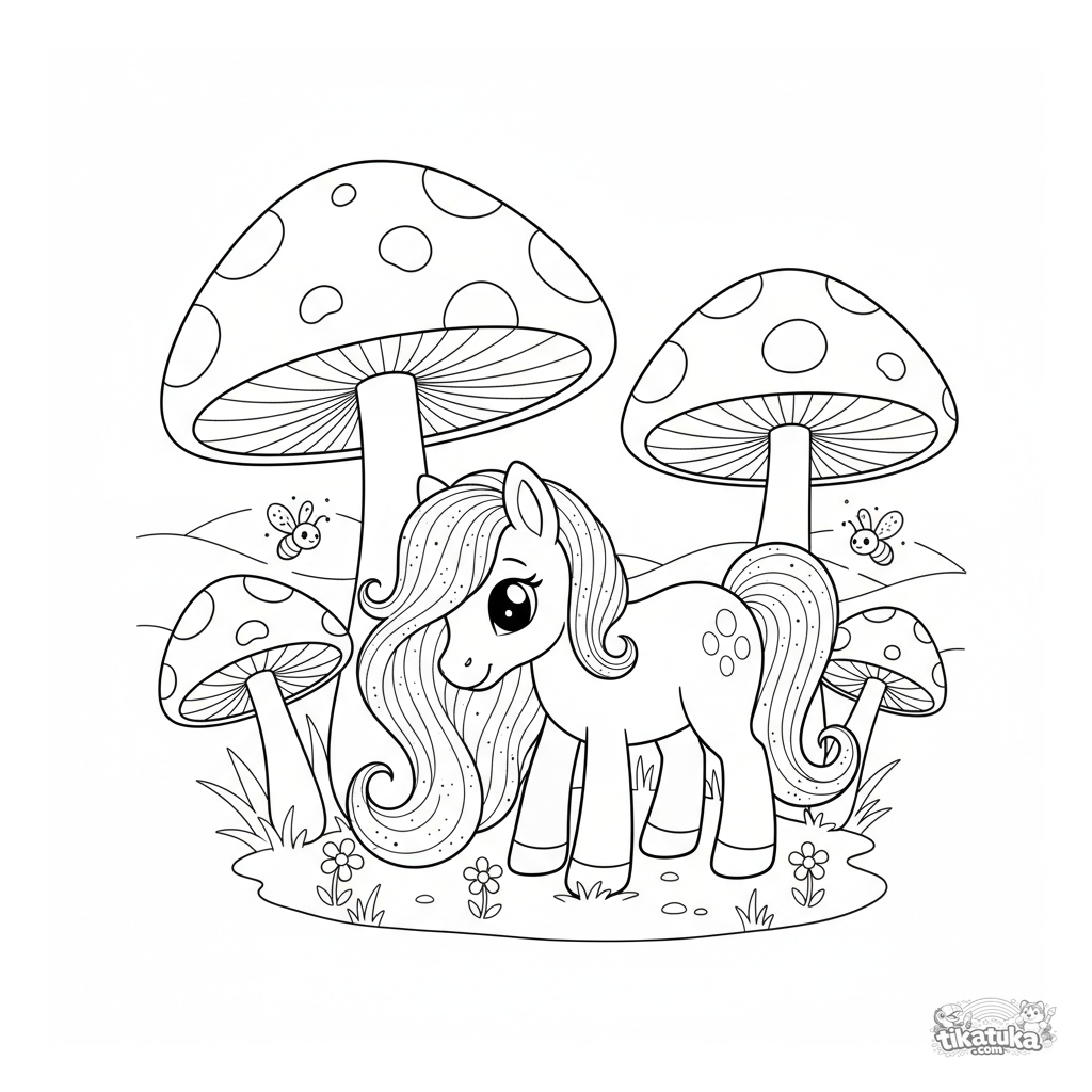 Página para colorear de un poni mágico con crines brillantes pastando en un prado de setas encantado. Para niñas de 4-6 años.