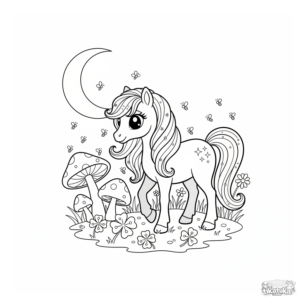 Página para colorear para niñas de 4-6 años: un poni mágico con crines como polvo de estrellas pace tréboles con rocío en un prado a la luz de la luna.