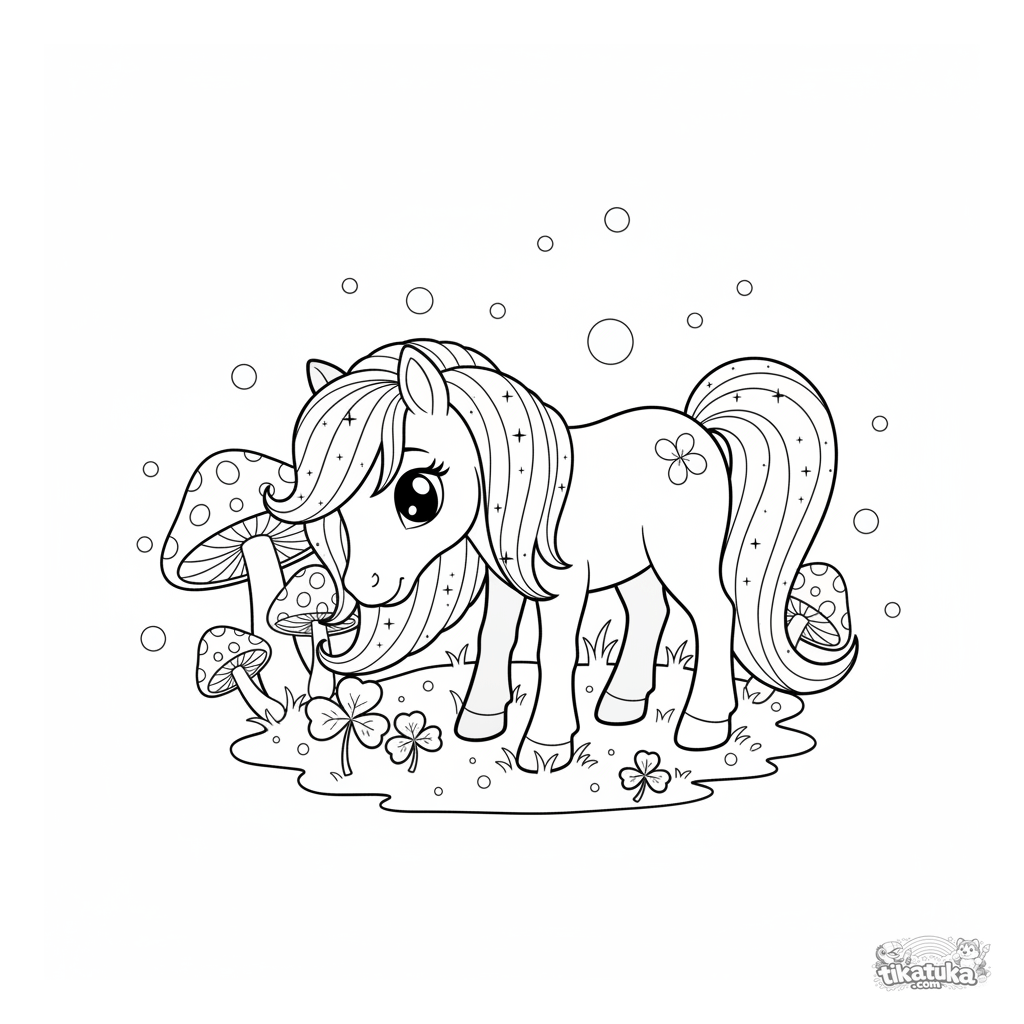 Página para colorear para niñas de 4-6 años: un poni mágico con crines brillantes pace en un prado encantado al anochecer entre hongos brillantes.