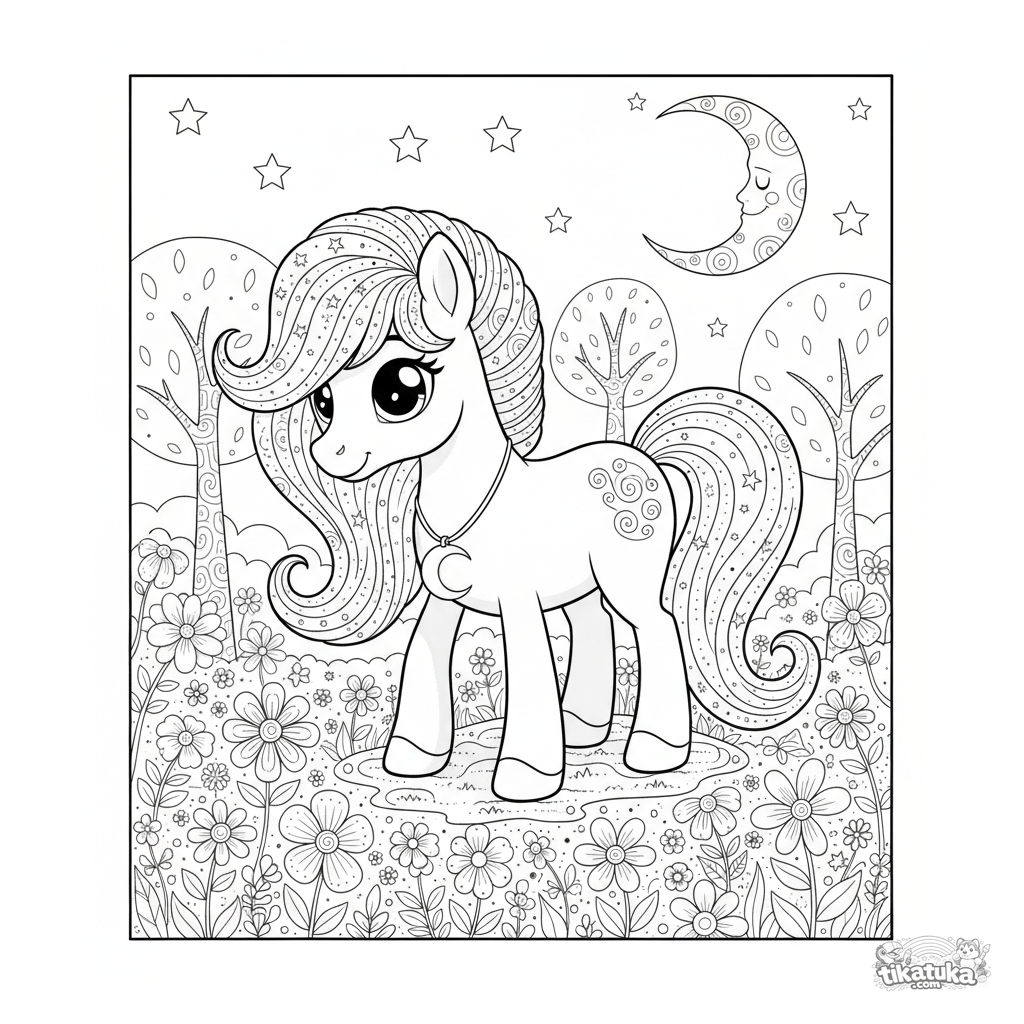 Página para colorear de un poni mágico con crines brillantes pastando en un prado de flores luminosas. Para niños de 6 a 9 años. Escena de fantasía con detalles hermosos.