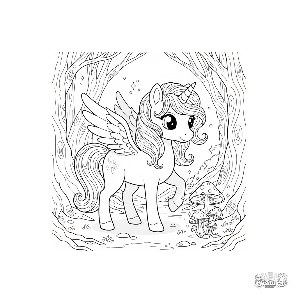 Página para colorear de un poni unicornio alado mágico en un bosque encantado. Para niños de 5 a 8 años. El poni mira hongos brillantes, luces centelleantes flotan alrededor y se ven raíces de árboles antiguas.