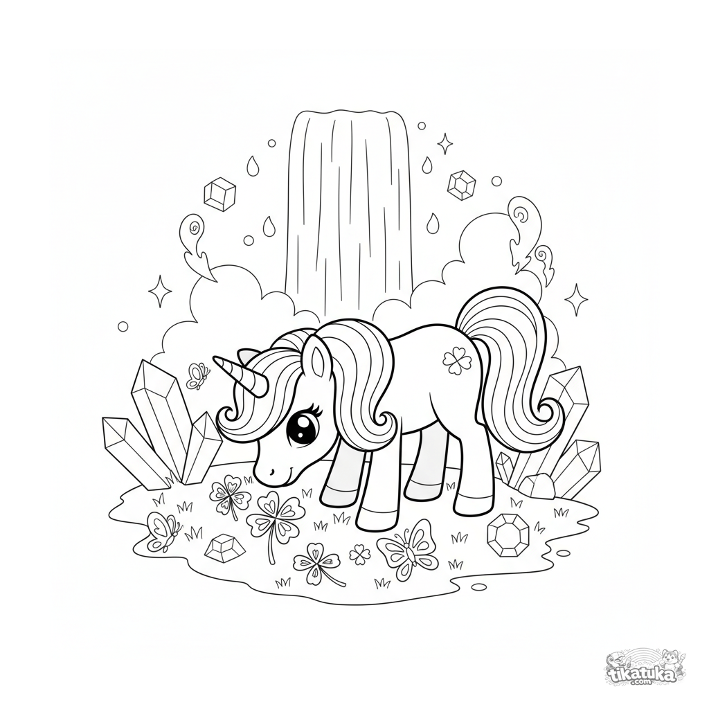Página para colorear difícil de un poni unicornio mágico en una pradera de cristal. Para niños de 8 a 12 años. Escena detallada con cascada, formaciones de cristal y chispas mágicas.