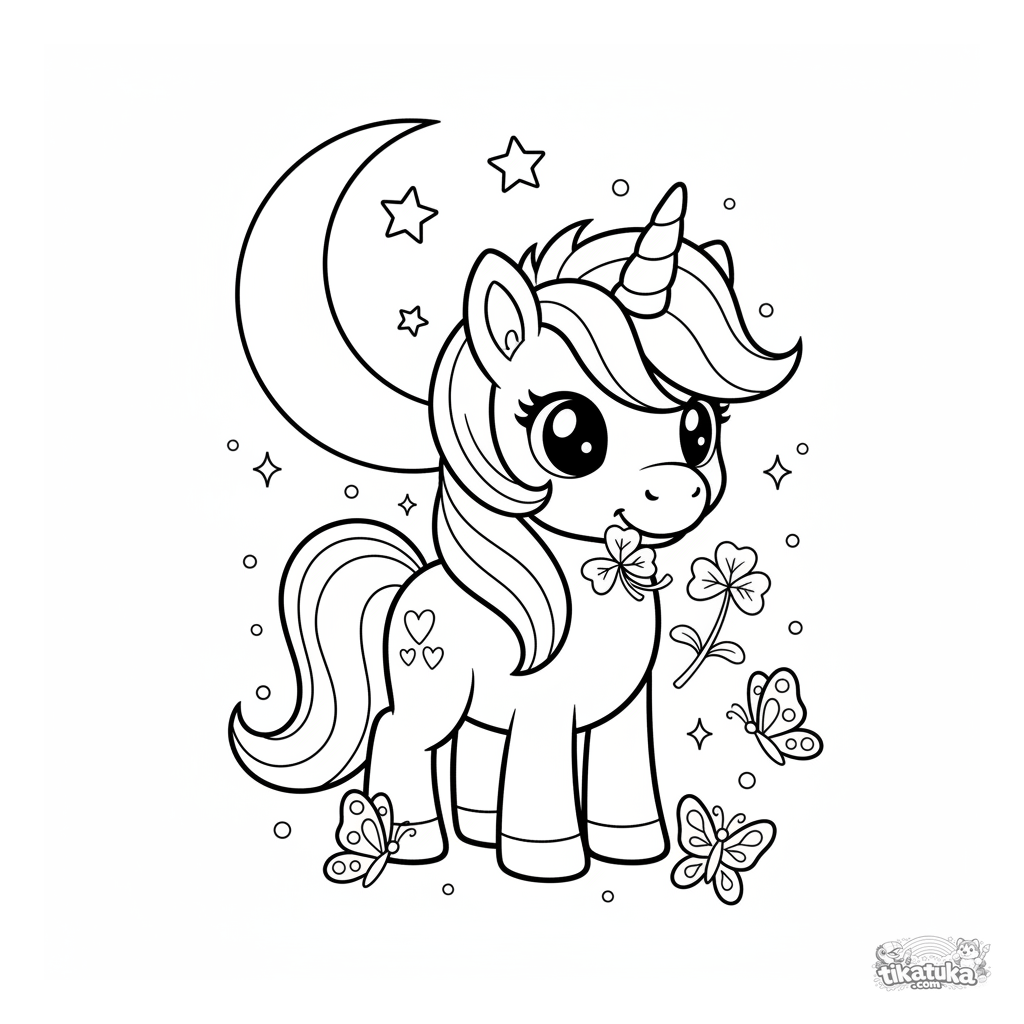 Página para colorear para niñas 4-6: un poni unicornio mágico pasea en un prado al claro de luna. Escena de cuento de hadas con mariposas.