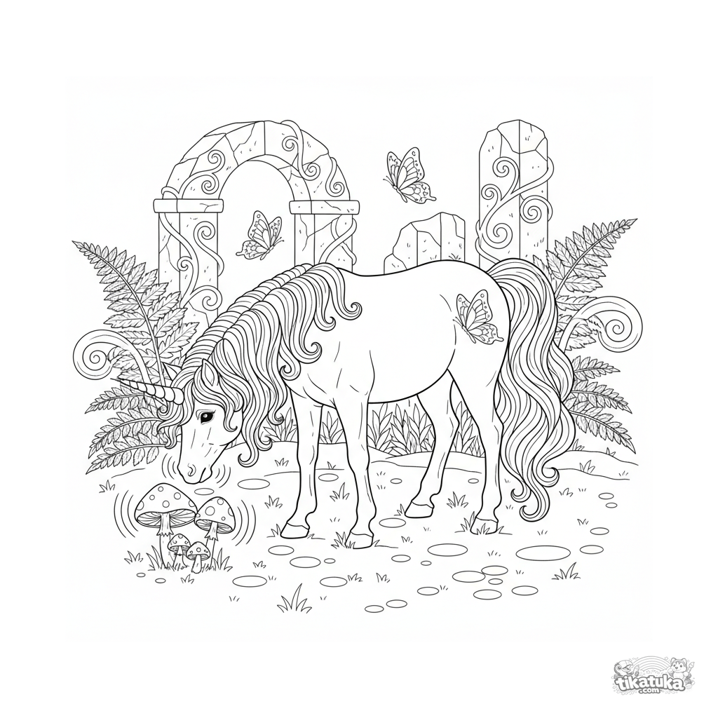 Página para colorear de un poni unicornio mágico con melena ondeante pastando en hongos brillantes en un bosque encantado. Para niños de 6 a 9 años.
