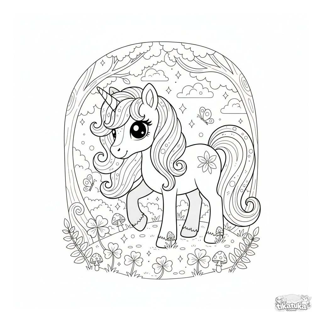 Página para colorear difícil para niños 8-12: un poni unicornio mágico pastando en un claro encantado con hongos brillantes. Alto detalle para colorear creativo.