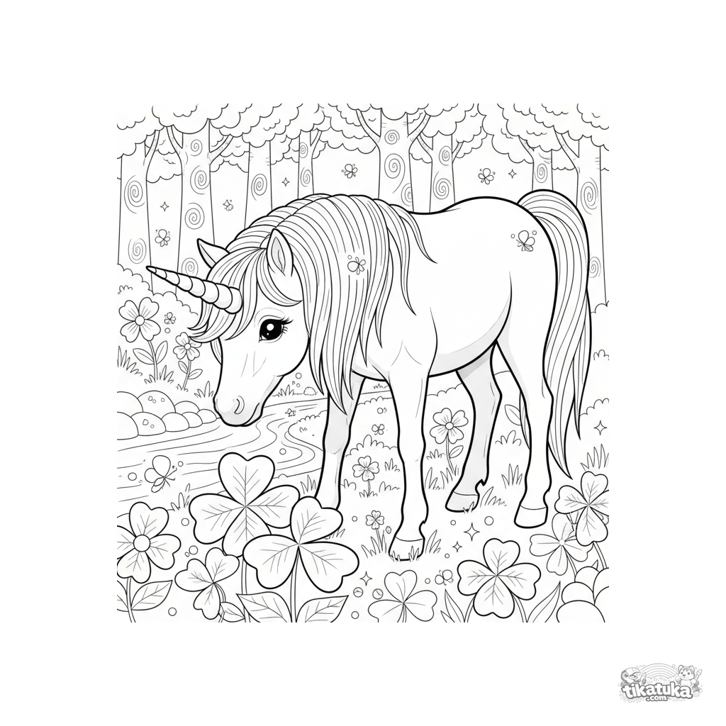 Página para colorear para niñas de 4-6 años: un hermoso unicornio pace en un prado encantado al anochecer. Líneas realistas pero simples.